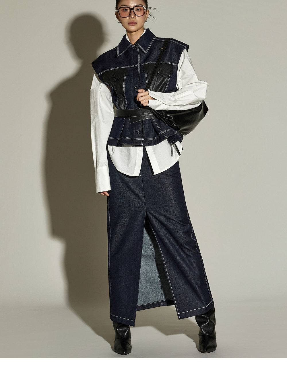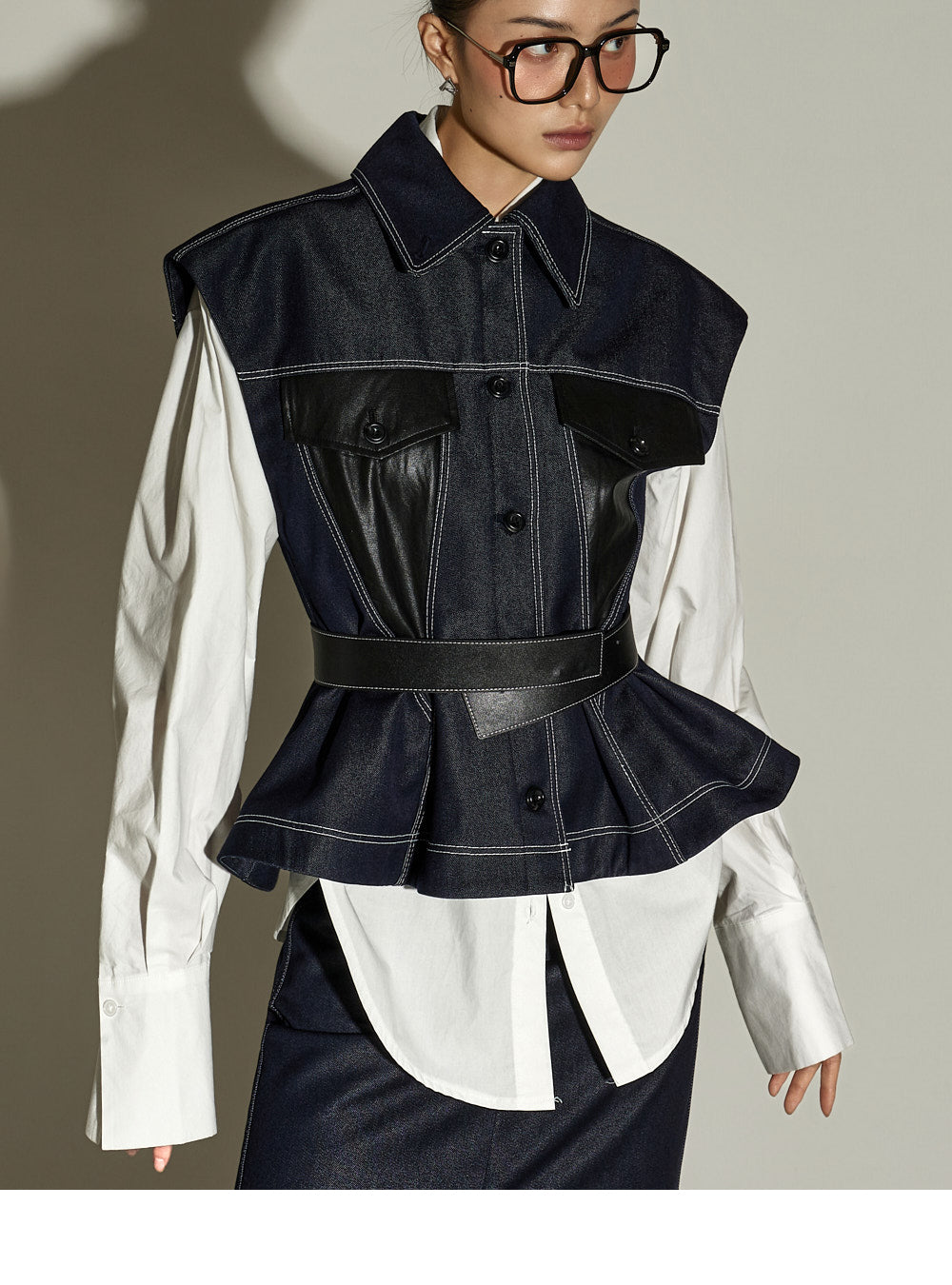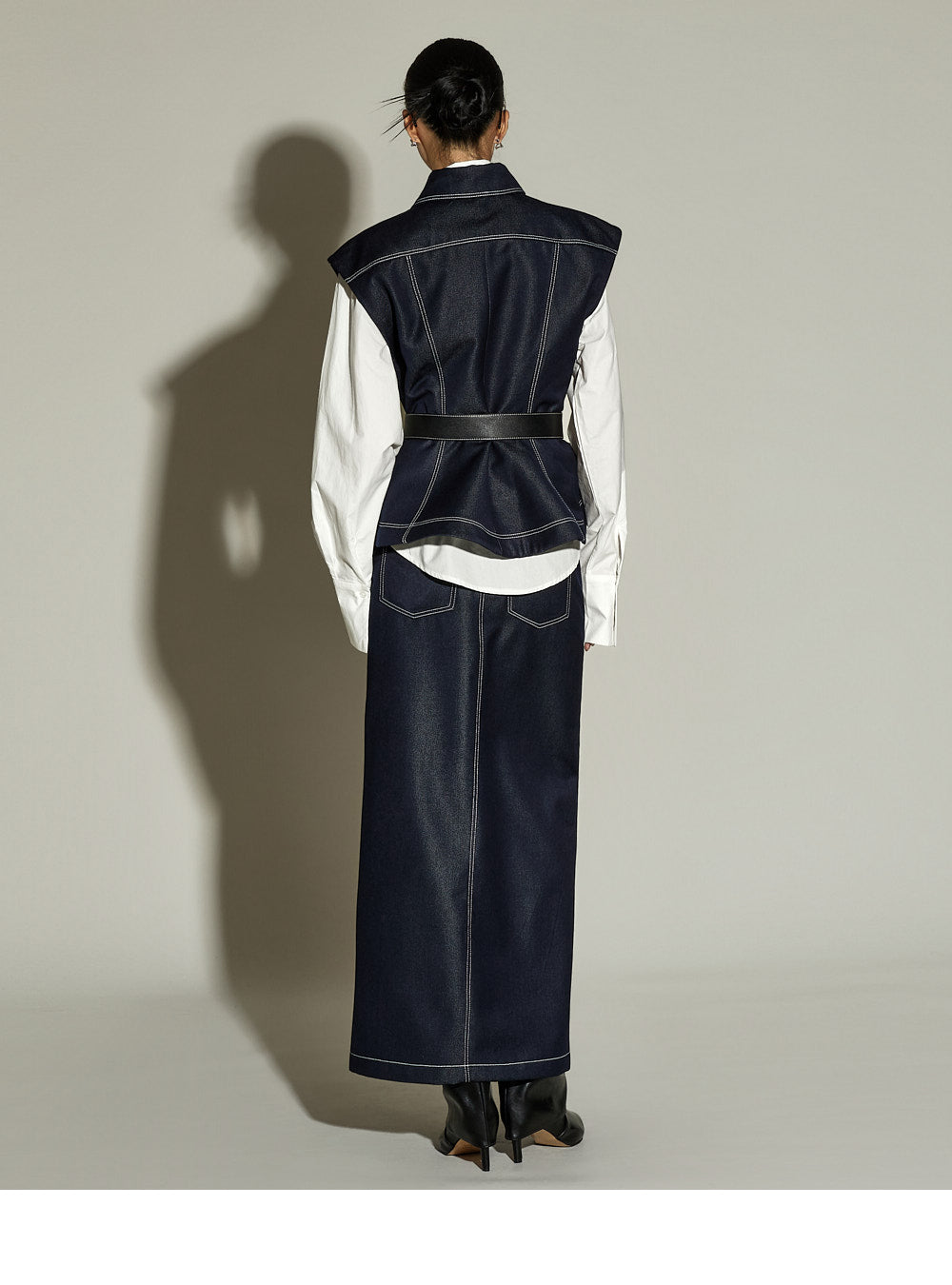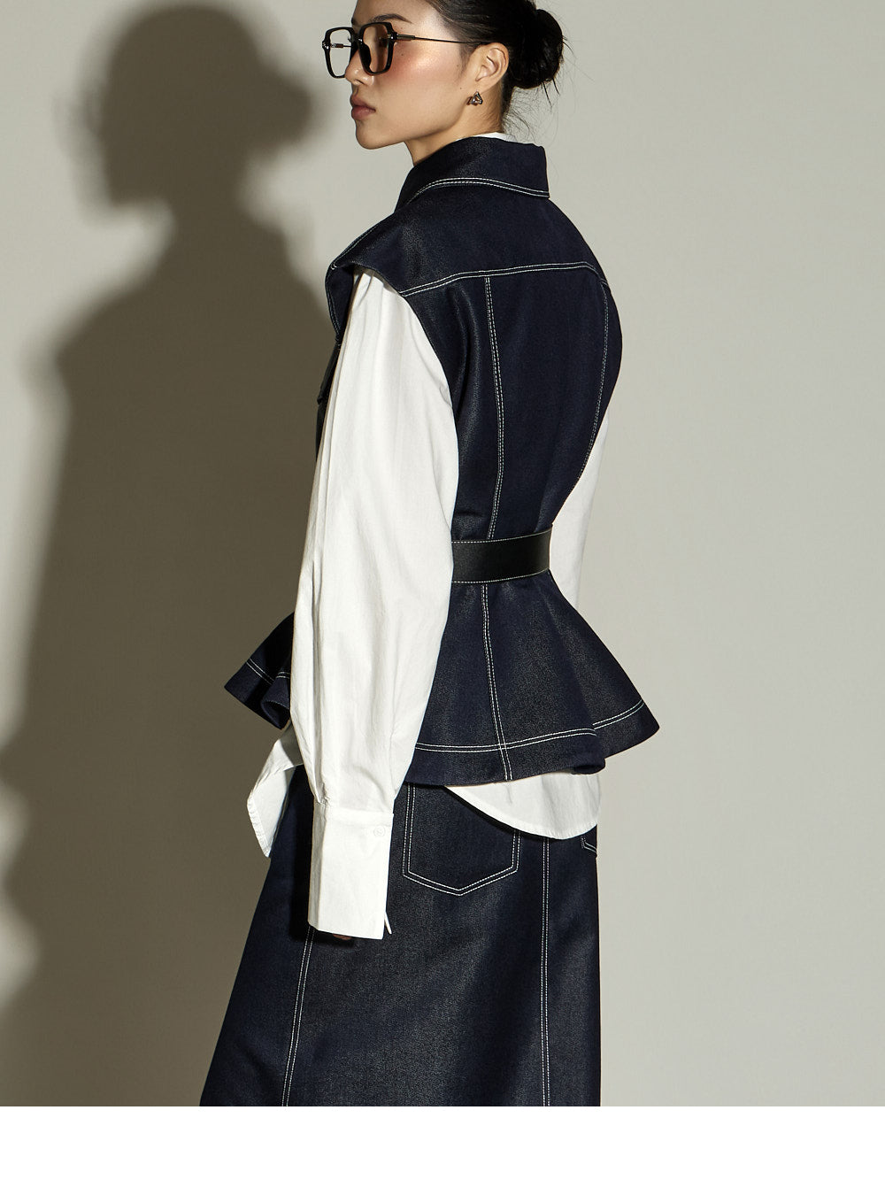 The vest has a slim fit, contrasting color details, and a flared hem,