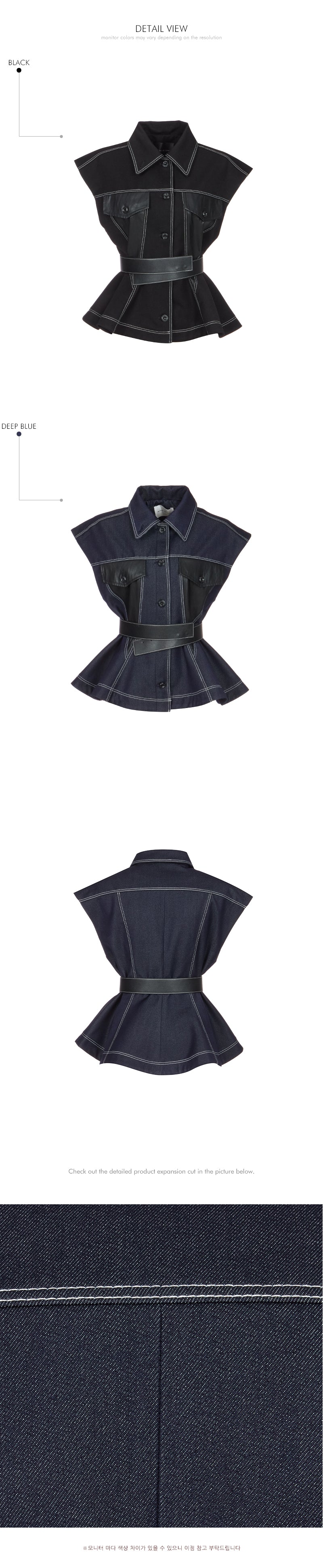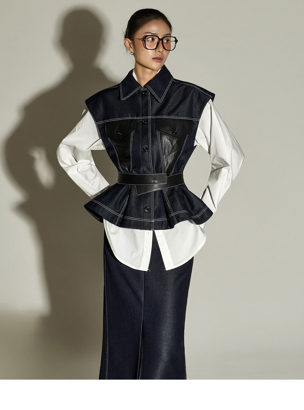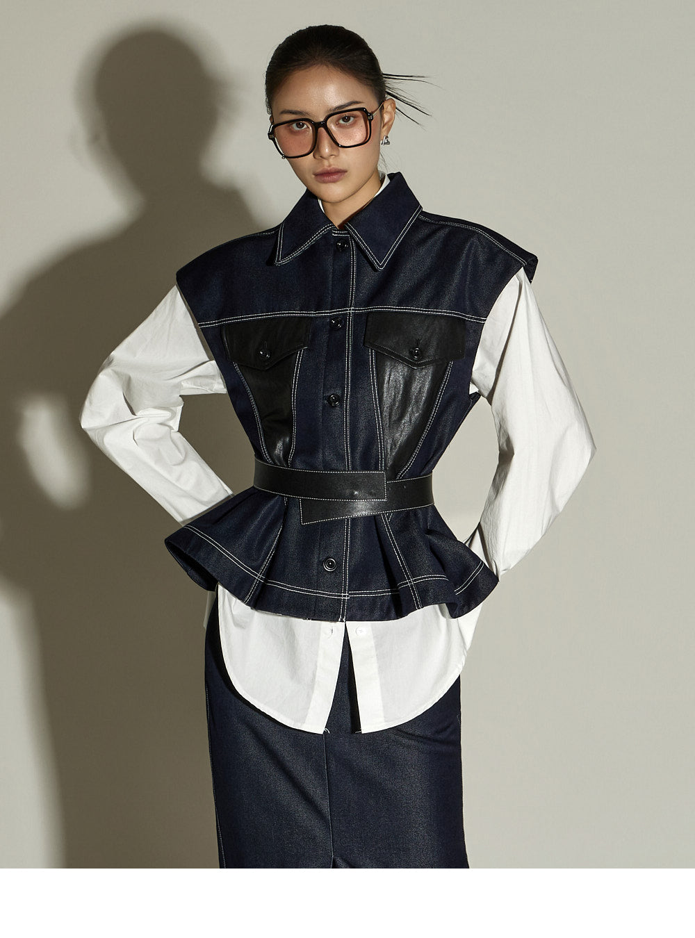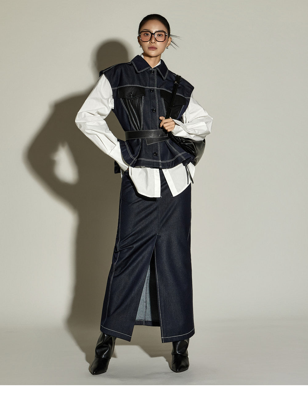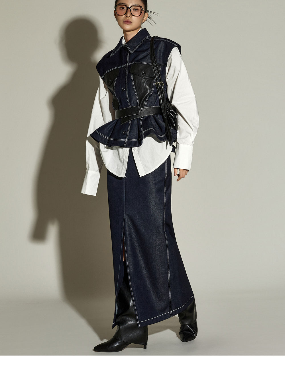 The vest has a slim fit, contrasting color details, and a flared hem,