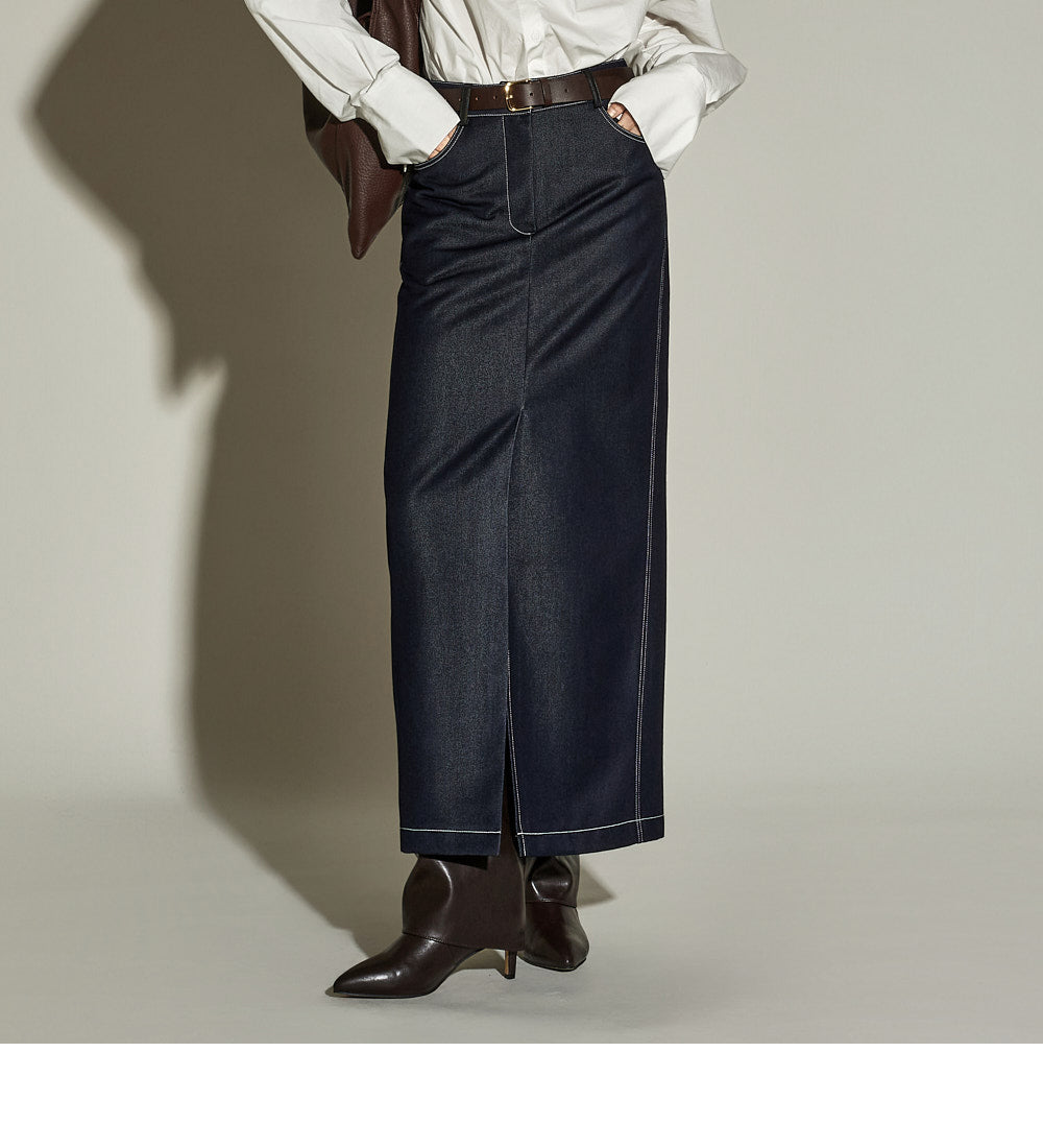 The skirt features an H-line silhouette and front slits for increased mobility,