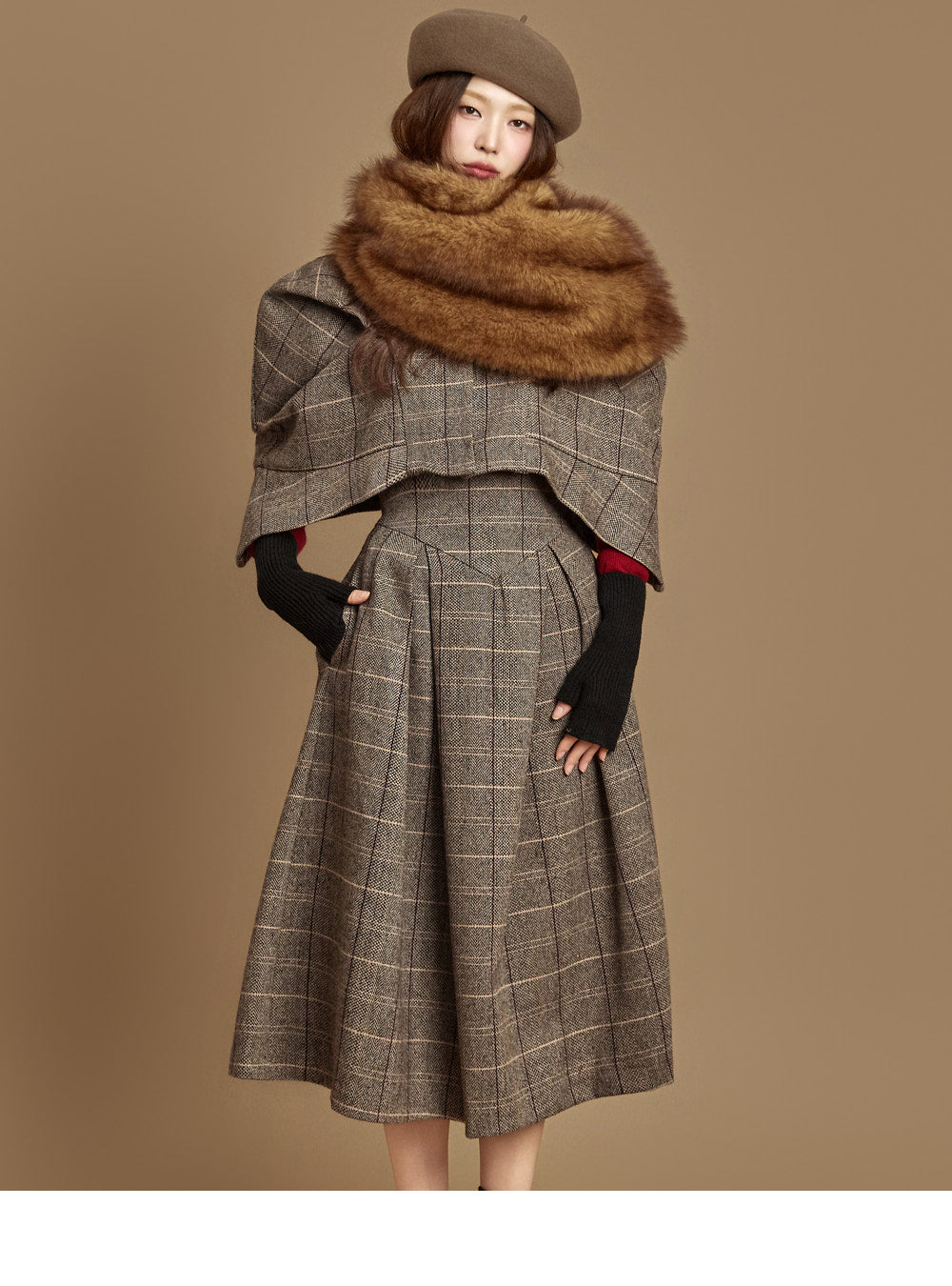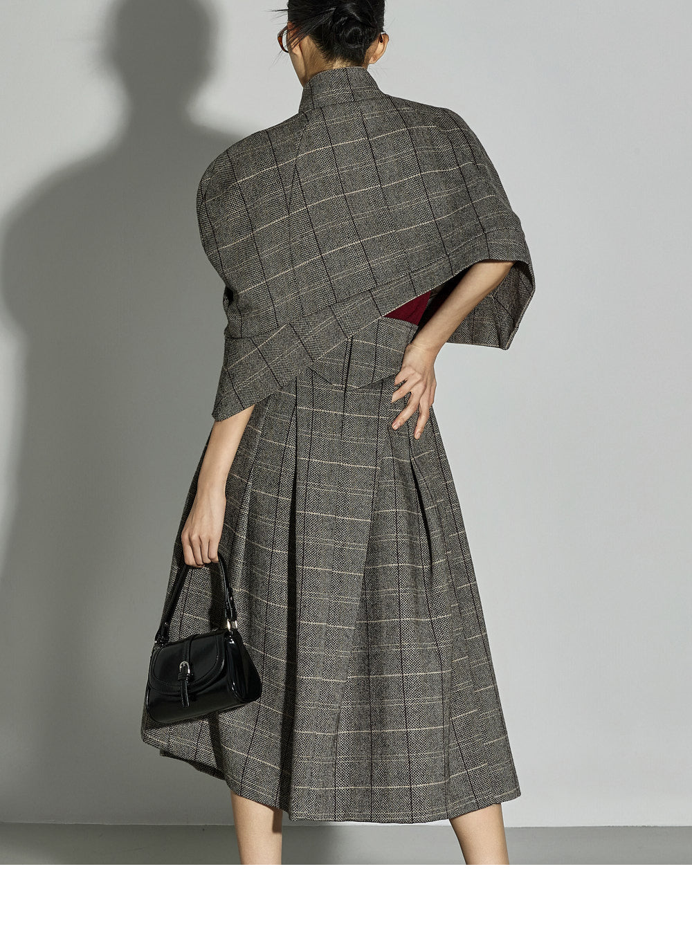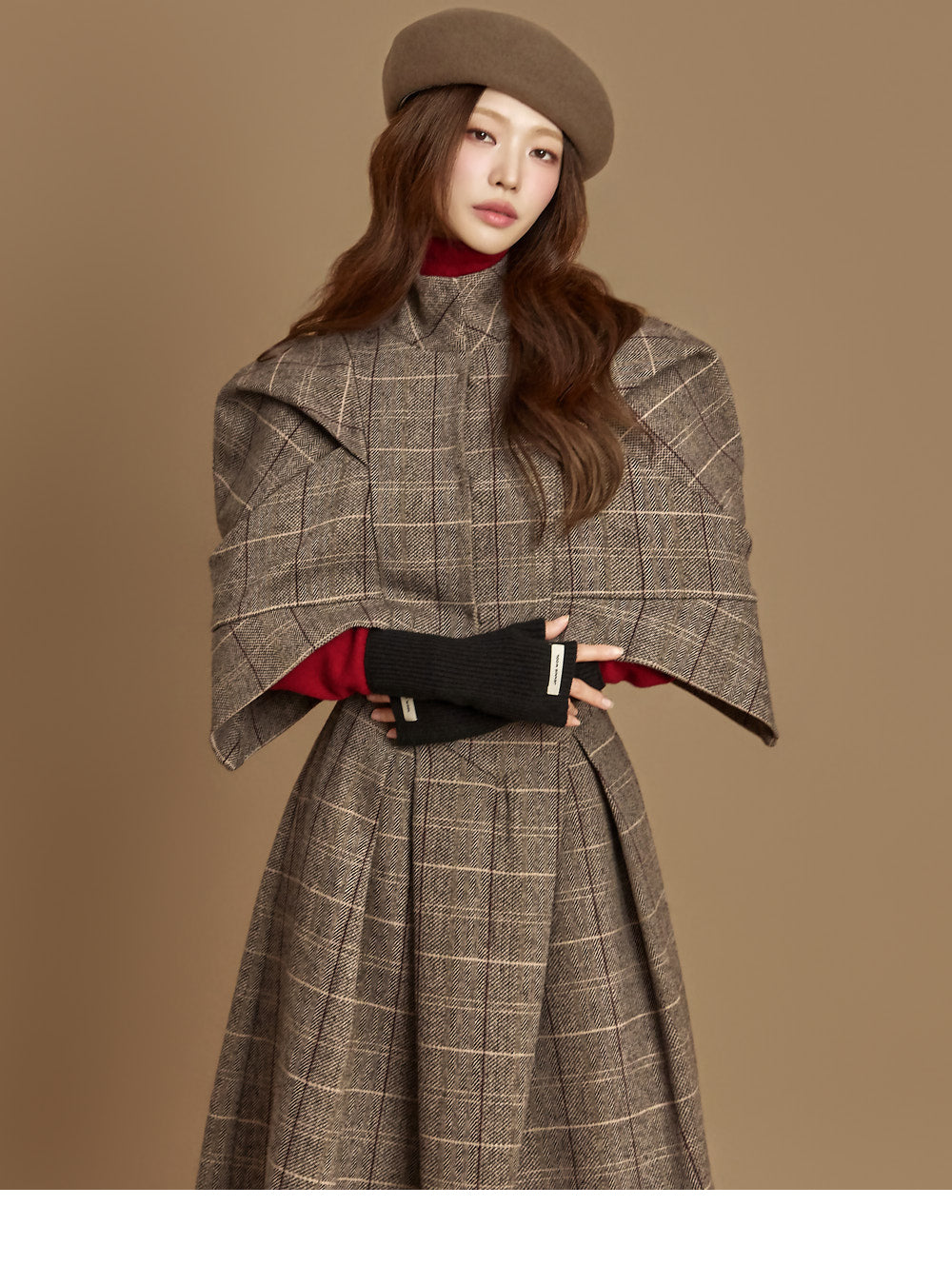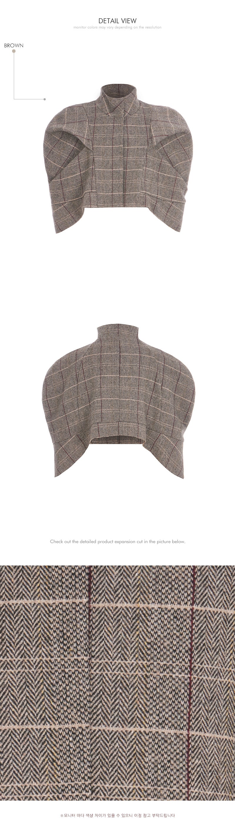 The jacket features a short, cape-style design,