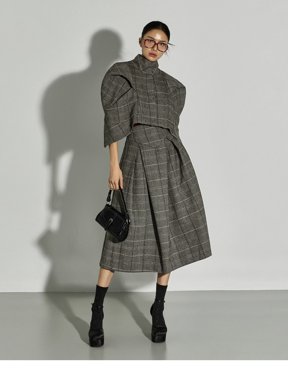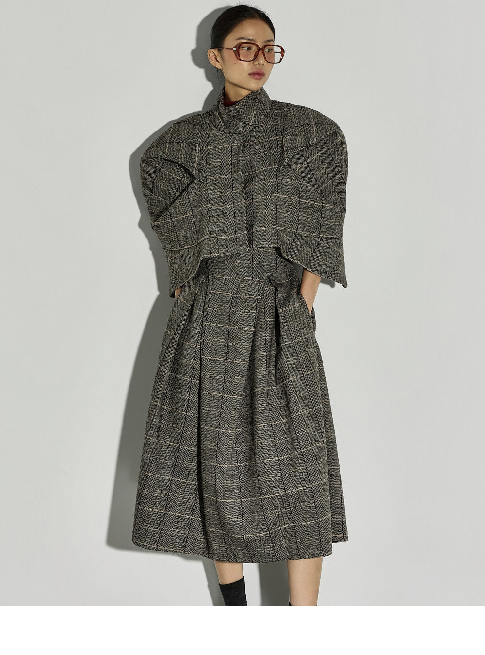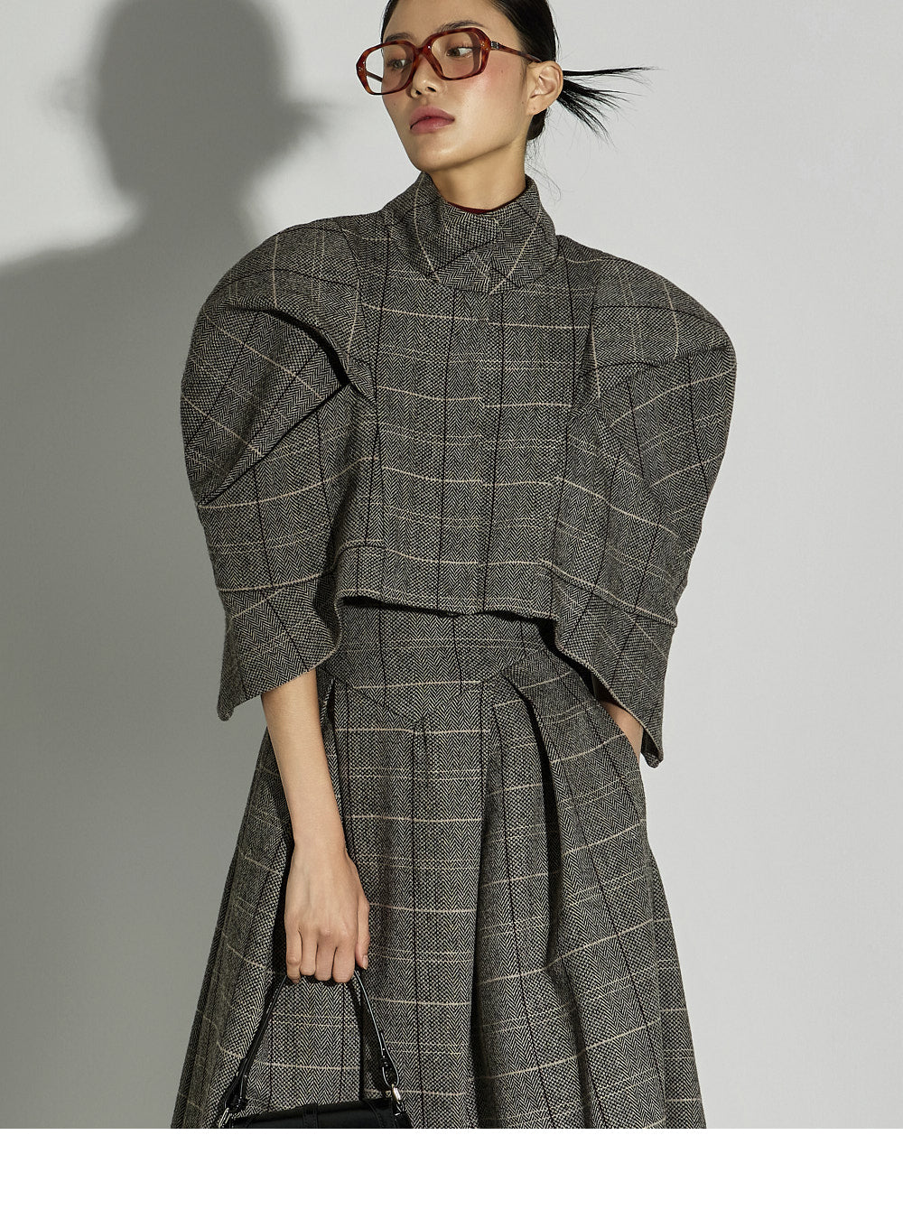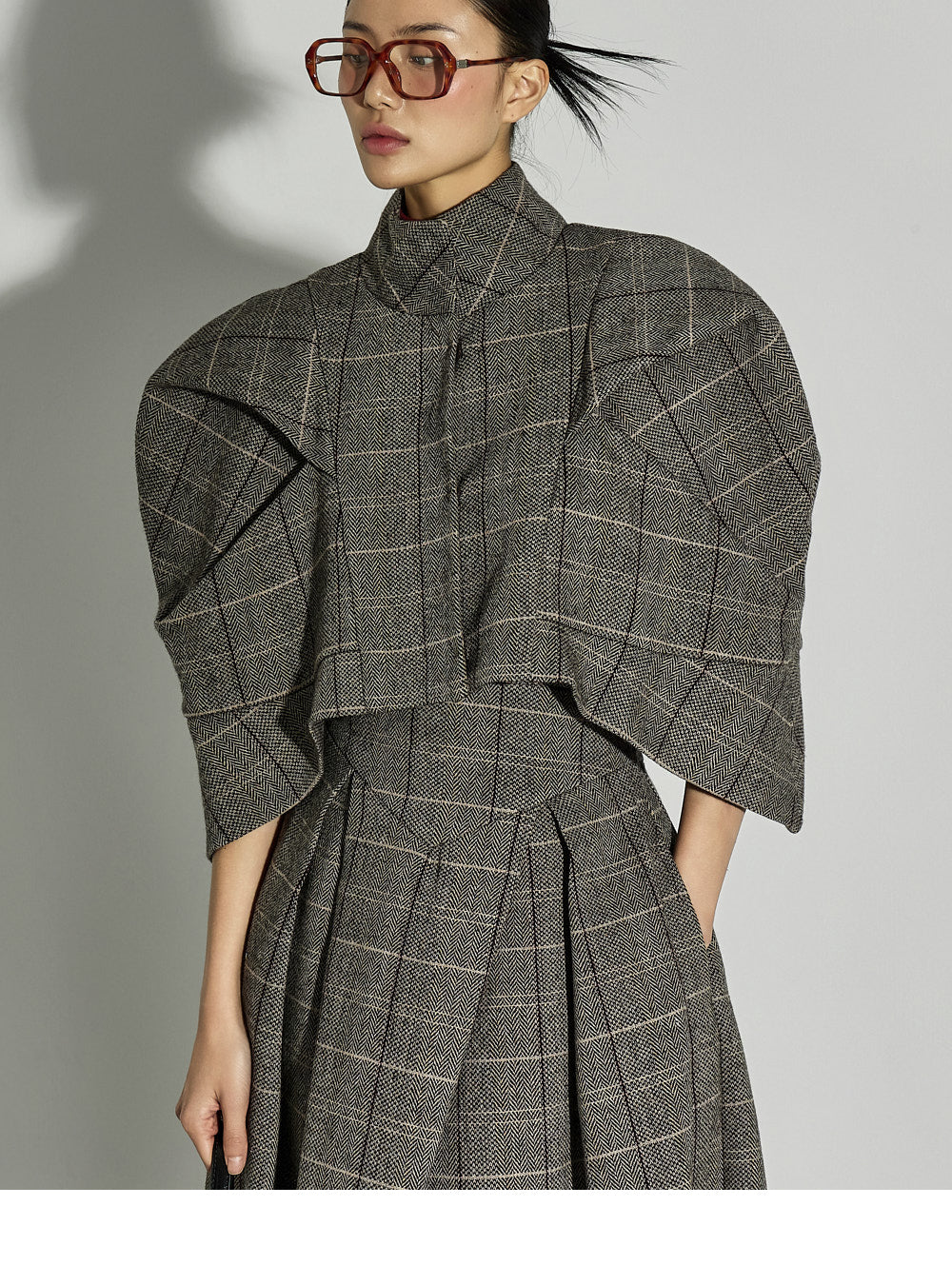 This uniquely styled check jacket and skirt set.