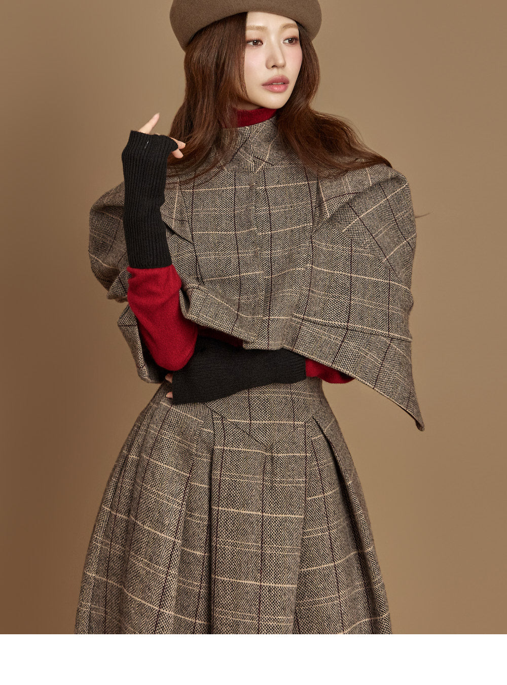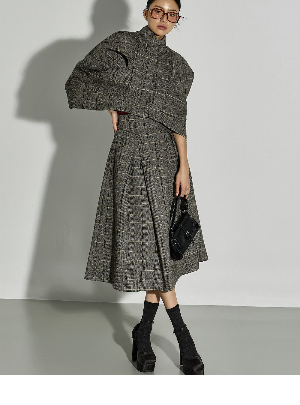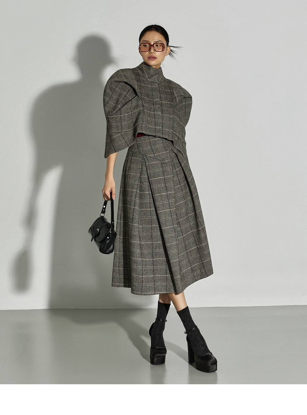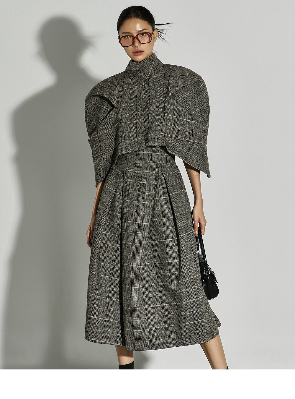 This uniquely styled check jacket and skirt set.