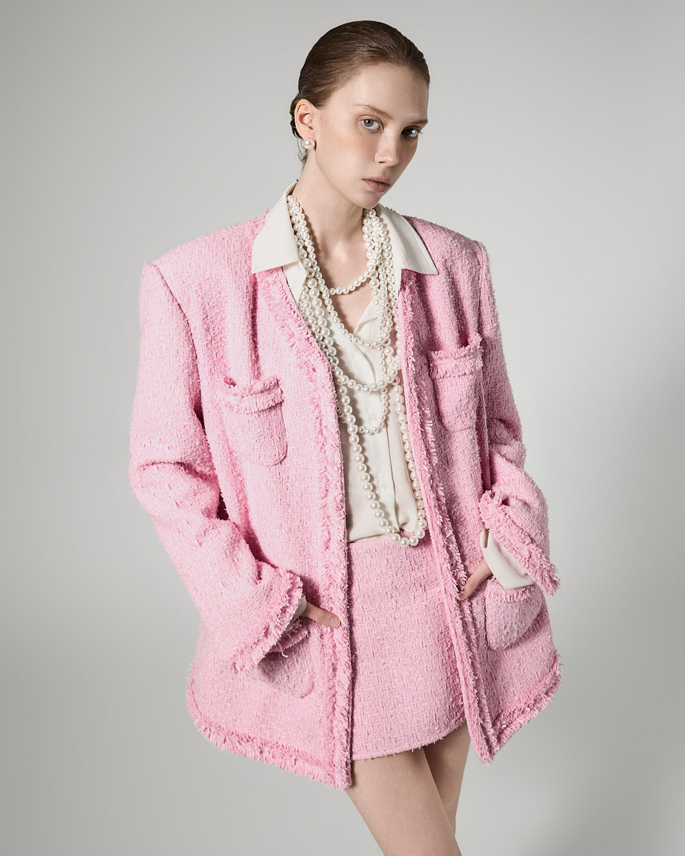 The jacket has a clean, oversized silhouette that falls neatly from the shoulders to the waist,