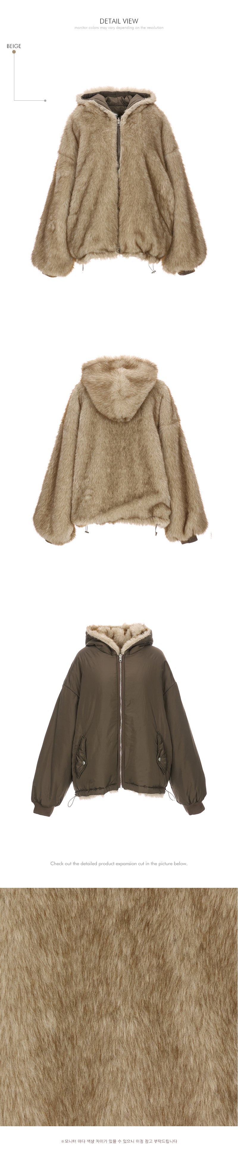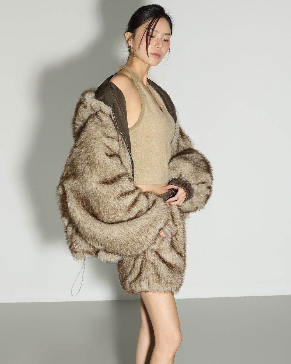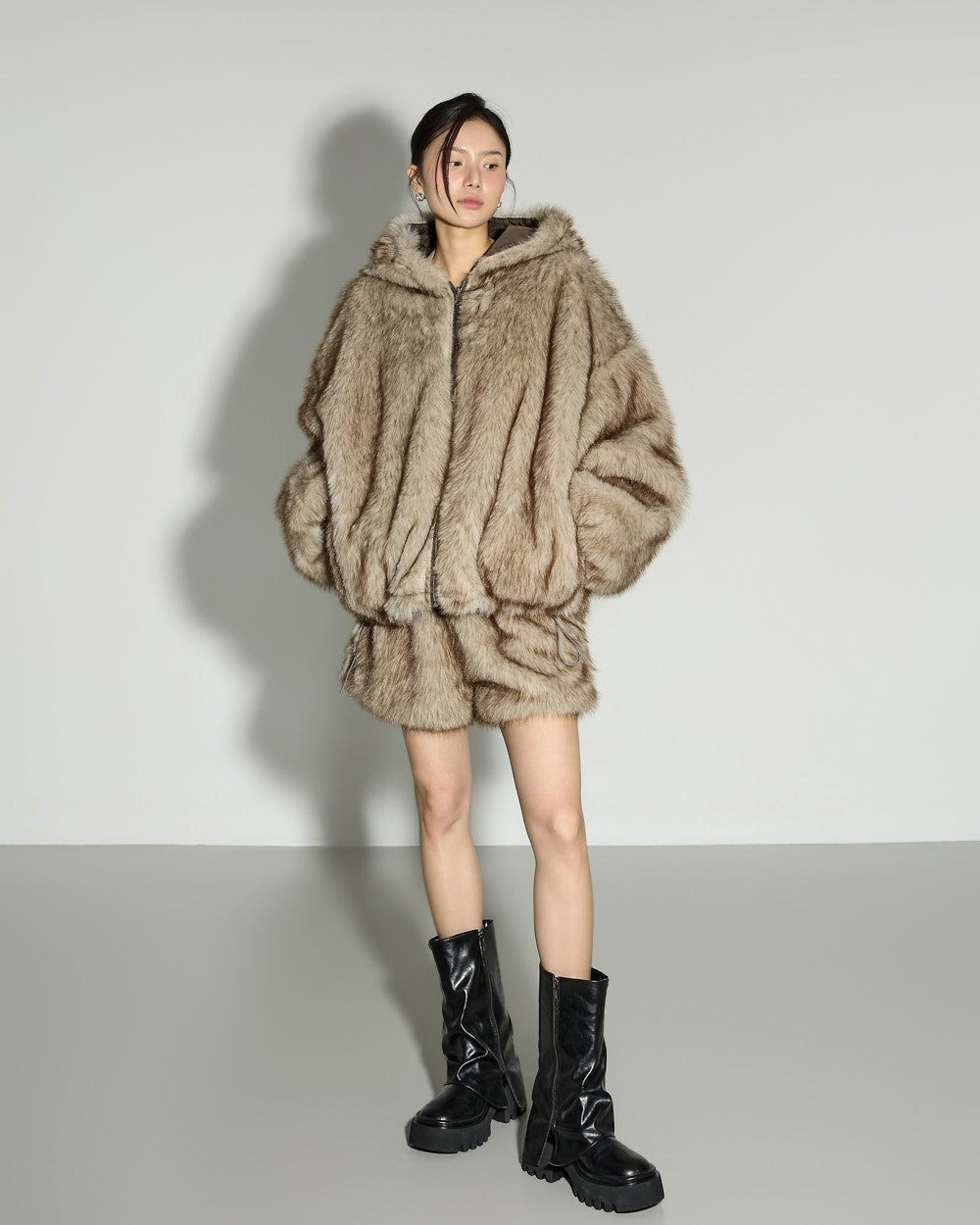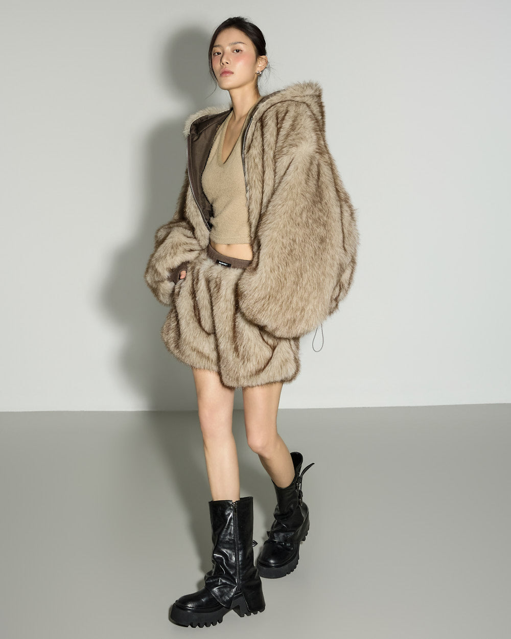 A casual reversible fur hooded set with a relaxed mood.